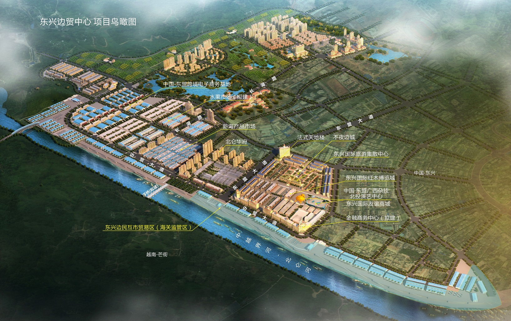 廣西東興邊貿(mào)中心項目是廣西東興市建設(shè)國家重點開發(fā)開放試驗區(qū)三大啟動項目之一。廣西北部灣投資集團有限公司作為廣西東興邊貿(mào)中心項目的投資主體,按高起點規(guī)劃設(shè)計、高速度投資建設(shè)項目。廣西東興邊貿(mào)中心項目以開發(fā)開放為指導,以興邊富民為目的,以邊貿(mào)加工為核心,以旅游產(chǎn)業(yè)為切合點。項目位于東興市區(qū)西北面,東至沿邊公路,西至大坪路,北至規(guī)劃的外環(huán)路,南鄰中越界河北侖河,與越南芒街市僅一河之隔。項目規(guī)劃總用地2000畝,總建筑面積126萬平方米,估算總投資50億元人民幣。規(guī)劃分為東興邊民互市貿(mào)易區(qū)、東興國際旅游集散中心、北侖河國際商貿(mào)城三大功能組團。